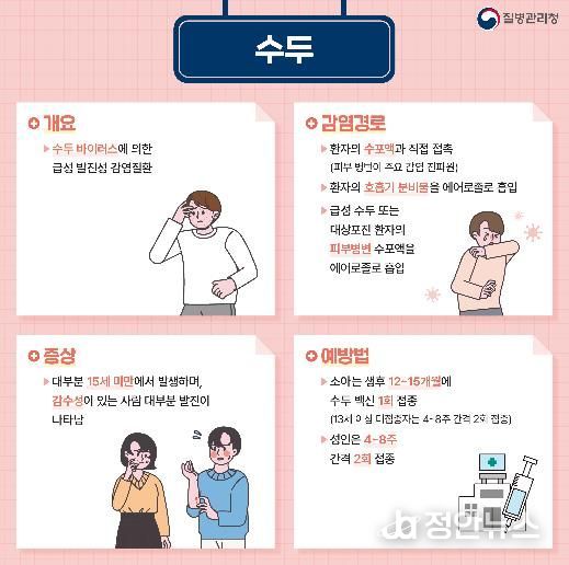 수두는 수두-대상포진 바이러스에 의해 발병하는 급성 바이러스성 질환으로, 발열과 함께 온몸에 수포성 발진이 나타나는 것이 특징이다.