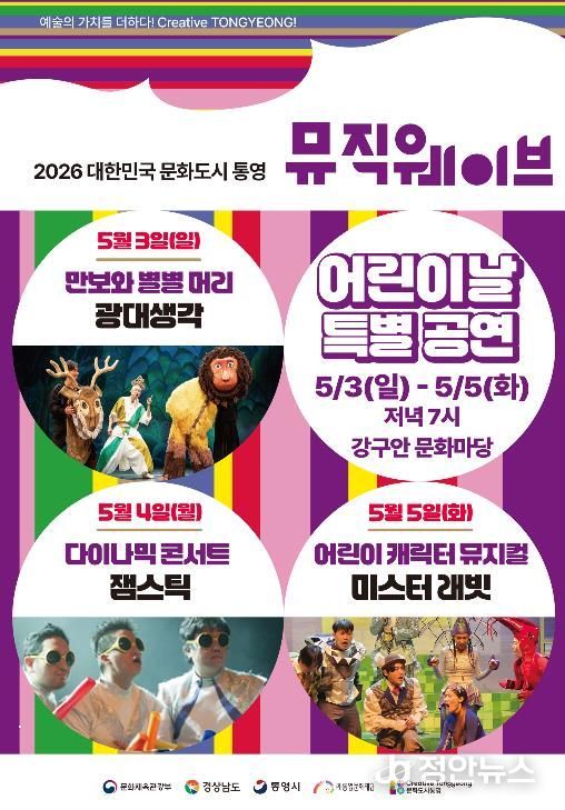 정안뉴스 김재홍 기자 | (재)통영문화재단은 어린이날을 맞아 오는 5월 3일부터 5일까지 3일간 오후 7시 강구안 문화마당에서 2026 뮤직웨이브 어린이날 특별공연‘만보와 별별머리’,‘다이나믹 콘서트’,‘미스터 래빗’을 진행한다.