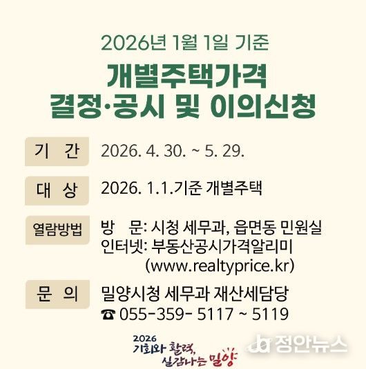정안뉴스 김재홍 기자 | 경남 밀양시는 2026년 1월 1일 기준 개별주택 2만 7,525호에 대한 주택가격을 오는 4월 30일 결정·공시하고, 5월 29일까지 이의신청을 접수한다고 밝혔다.