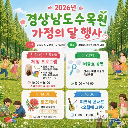 정안뉴스 김재홍 기자 | 경상남도산림환경연구원은 가정의 달 5월을 맞아 오는 5월 2일부터 16일까지 경상남도수목원 잔디원 일원에서 가족 단위 방문객을 위한 체험·공연·나눔 행사를 운영한다고 밝혔다.