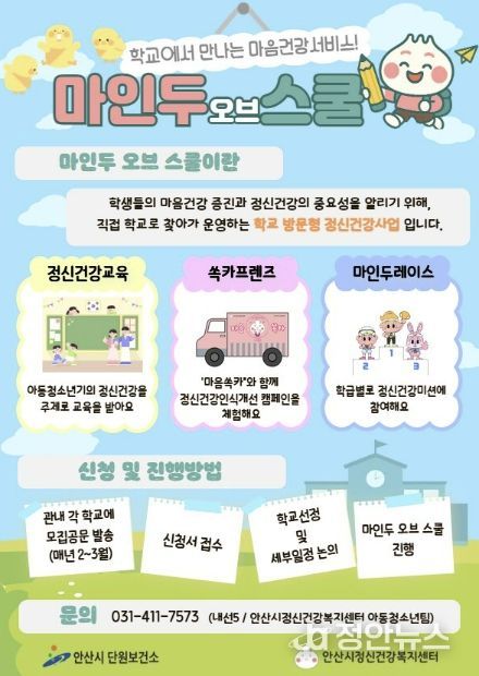 정안뉴스 안정주 기자 | 안산시 정신건강복지센터는 11월까지 관내 초·중·고등학교 총 10개교를 대상으로 학교로 찾아가는 정신건강사업 ‘마인두 오브 스쿨’을 운영한다고 30일 밝혔다.