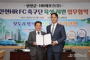 정안뉴스 황은경 기자 | 충북 진천군은 군청 소회의실에서 HR레포츠 주식회사(대표 신호룡)와 ‘진천 HR FC 축구단 육성 및 지원을 위한 업무협약’을 체결했다고 24일 밝혔다. 이번 협약은 2026년 대한축구협회 K4 리그 참가를 앞두고, 진천 HR FC의 안정적인 운영 기반을 마련하고, 지역 스포츠 발전을 위한 협력 체계를 구축하기 위해 추진됐다. 협약식에는 송기섭 진천군수와 HR레포츠(주) 신호룡 대표, 김화영 진천군 체육회장, 김중기 진천군 축구협회장 등 관계자들이 참석했다. 협약의 주요 내용은 △축구단 운영과 발전 지원 △유소년 축구 육성과 저변 확대 △지역사회 공헌 활동 △스포츠마케팅을 통한 지역 홍보 강화 등이다. 군은 이번 협약을 통해 지역 스포츠 브랜드 가치 제고, 군민 스포츠 관람 문화 정착, 유소년·생활 체육 연계 강화 등 다양한 효과를 기대하고 있다. 앞으로 군은 행정적·재정적 지원과 경기장 관련 시설 활용 지원 등에 협력하고, HR 레포츠는 선수단 운영, 스포츠마케팅, 유소년 프로그램 운영 등을 총괄하며 지역 축구 문화 확산에 힘쓸 예정이다. 송기