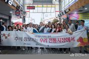 정안뉴스 황은경 기자 | 충주시는 2일 자유·무학시장 일원에서 ‘추석맞이 전통시장 장보기 행사’를 열고 명절을 앞두고 위축된 전통시장에 활력을 불어넣었다. 이번 행사는 물가 상승과 경기침체로 어려움을 겪고 있는 시장 상인들을 격려하고 지역경제를 활성화하고자 마련됐다. 이날 행사에는 충주시청 직원들과 소비자보호단체, 전통시장 연합회, 농협, 신한은행 관계자 등 60여 명이 참여해 제수용품과 농‧축산물 등을 직접 구입하며 전통시장 활성화에 힘을 보탰다. 또한, 전통시장 이용객과 상인들을 대상으로 물가안정 캠페인을 실시해 건전한 소비 분위기 확산을 유도했다. 시는 지역 내 소비 진작과 충주사랑상품권 이용 활성화를 위해 지난 9월부터 할인율을 13%로 상향해 운영하고 있으며, 추석 황금연휴가 이어지는 12일까지 충주사랑상품권 시민 이벤트를 시행하고 있다. 조길형 충주시장은 “물가 상승과 소비 위축으로 전통시장과 골목상권이 위축되고 있다”라며, “전통시장과 지역 상권을 많이 찾아주셔서 지역상권 활성화에 동참해 주시길 바란다”라고 당부했다. 한편, 시는 추석 명절을 맞아 지역 상권 활