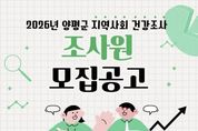 정안뉴스 안정주 기자 | 양평군은 질병관리청 및 양평군보건소와 공동으로 추진하는 ‘2026년 지역사회 건강조사’에 참여할 조사원 6명을 모집한다고 밝혔다. 지역사회 건강조사는 지역 주민의 건강 수준과 생활 습관, 만성질환 현황 등을 파악해 지역 특성에 맞는 보건 정책 수립의 기초 자료로 활용하기 위해 매년 실시되는 국가승인통계다. 이번 조사는 5월 16일부터 7월 31일까지 약 2개월 반 동안 진행되며, 조사 진행 상황에 따라 종료일은 변경될 수 있다. 모집 분야는 ‘2026년 지역사회 건강조사 조사원’으로, 근무 지역은 양평군 관내이며 모집 인원은 총 6명이다. 선발된 조사원은 조사 수행에 앞서 표본지점 확인을 위한 사전 조사를 실시하고, 조사 대상 가구로 선정된 표본가구를 직접 방문해 19세 이상 성인을 대상으로 스마트 기기(태블릿 PC)를 활용한 1대1 면접 조사를 수행하게 된다. 전형은 1차 서류 전형과 2차 면접 전형으로 진행된다. 군은 서류 전형에서 응시자의 자격 및 경력의 적합 여부를 심사하며, 1차 합격자를 대상으로 면접 전형을 실시한다. 원서 접수 기간은 3월 5일부터 13일까지이며