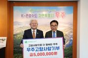 정안뉴스 안정주 기자 | DH그룹(동해금속(주), 나봄리조트 등) 서동해 회장이 지난 24일 무주군에 고향사랑기부금 5백만 원을 기탁했다. 이날 서동해 회장은 "무주군은 나봄리조트를 통해 소중한 인연을 이어가고 있는 곳”이라며 “무주군과의 상생을 위해 앞으로도 세심한 관심을 쏟을 것”이라고 밝혔다. 전북 완주군에 본사를 둔 DH그룹은 주력 사업인 상용차 및 승용차 부품 생산 분야에서 ‘작지만 강한 기업’으로서의 입지를 확고히 하고 있으며 무주군 설천면에서는 나봄리조트를 운영하고 있다. 봉사 경영을 통한 사회 환원에도 적극적인 것으로도 알려진 DH그룹은 2008년에 설립된 '권정순 장학재단'을 통해 저소득층 지원, 청소년 장학사업, 소외된 이웃돕기 등 사회공헌 활동에 연간 3억여 원을 투입하고 있다. 무주군에는 2023년부터 3년간 총 1천1백만 원의 고향사랑기부금을 기탁해 훈훈함을 전하고 있다.