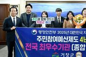 정안뉴스 김재홍 기자 | 거창군은 지난 16일 정부세종청사에서 행정안전부가 주최하는 2025년 대한민국 지방재정대상 시상식에서 주민참여예산제도 운영 4년 연속 전국 최우수기관으로 선정되어 장관 기관표창과 함께 재정 인센티브 5천만 원을 받았다. 행정안전부는 매년 전국 지방자치단체 243개를 대상으로 주민참여예산제도 성과평가를 통해 지자체의 건전한 재정 운용과 지방재정 민주성책임성투명성 평가해 광역·시· 군·구 별로 각 1개씩 총 4개 기관만을 최우수기관으로 선정하고 있다. 거창군은 2018년, 2021년 우수기관에 선정된 데 이어, 2022년부터 2025년까지 4년 연속 최우수기관으로 선정되는 성과를 거뒀으며, 이는 전국 군 단위 82개 지자체 가운데 최상위 수준의 운영 역량을 입증한 것이다. 특히 올해는 ‘공감과 성장-진화하는 거창형 주민참여예산’이라는 슬로건 아래, △찾아가는 주민 예산학교 미래세대(초 · 중 · 고 · 대학생) 확대 운영으로 미래세대의 참여 환경 조성 △‘모방과 경연’을 주제로 거창군만의 차별화된 제안사업 공모유형을 다양화해 창의적 행정문화 확산 △회의 진행보조자(퍼실리테이터)를 활용