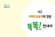 정안뉴스 박상욱 기자 | 광주광역시 서구가 아파트공동체 활성화를 위해‘서구 아파트공동체의 정원, 똑똑(talk,talk) 안내서’를 제작했다. 이 책자는 다양한 주민 참여 프로그램을 통해 아파트공동체 활동에 대한 주민들의 관심을 이끌어 내고, 아파트 생활 시 발생하는 문제점을 공동체적 관점으로 해결하도록 안내하는 지침서이다. 안내서에는 ▲아파트공동체 구성 및 활동을 위한 실행단계(5단계) ▲우리 아파트공동체 활동현황 및 우수사례 소개(8개 분야) ▲서구 아파트공동체 공모사업 안내 등 다양한 정보가 수록되어 있다. 서구는 19일부터 시작되는 ‘세상에서 가장 큰 대학 아파트학교’ 참여자들에게 안내서를 배포하고, 이를 활용한 아파트공동체 활동 홍보에 나설 예정이다. 또한 아파트공동체 전문가지원단이 현장을 찾아가 아파트 특성에 맞는 공동체 활동 발굴을 위한 맞춤형 컨설팅을 진행할 계획이다. 정의춘 서구 마을공동체지원센터장은 “아파트공동체 활동에 대한 이해를 도모하고, 주민들의 역랑강화를 통해 공동체 활동에 참여할 수 있는 기회를 확대해 나가겠다”고 말했다. 한편 서구는 지속 가능한