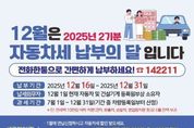 정안뉴스 안정주 기자 | 평택시는 2025년 12월 정기분 자동차세 16만 5천 건에 대해 199억 원을 부과·고지하고 납부 기한 내 납부하도록 적극적인 홍보에 나섰다고 밝혔다. 자동차세는 연 2회(6월, 12월) 부과하는 정기분 세목으로, 이번 제2기분 자동차세 부과 대상은 과세기준일인 12월 1일 현재 평택시에 등록되어있는 자동차, 이륜차, 건설기계 등이며, 7월 1일부터 12월 31일까지의 보유기간에 대해 차량의 용도와 차종, 배기량, 차령에 따라 세액을 차등 적용하여 부과한다. 아울러, 연세액 10만 원 이하의 경차·화물차·승합차량은 6월에 전액 과세하나 6월 이후에 취득했다면 이번 제2기분 과세 대상에 포함되며, 자동차세를 연납한 차량은 이번 과세 대상에서 제외된다. 납부 기한은 12월 16일부터 31일까지이고, 고지서는 우편 발송되며 전자고지 신청자는 전자우편 또는 모바일 앱에서 확인이 가능하다. 납부는 ‘지방세입계좌’ 서비스를 통해 이체 수수료 없이 납부할 수 있으며, 이외에도 전국 금융기관 방문 혹은 은행 자동화기기(CD/ATM) 등에서도 고지서 없이 신용카드 또는 통장으로 납부할 수