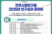 정안뉴스 안정주 기자 | 전주시정연구원(원장 박미자)은 개원 2주년을 맞아 27, 28일 양일간 전주시 주요 정책 연구성과를 공유하는 ‘2025년 연구성과 공유회’를 개최한다고 26일 밝혔다. 전주시 소통협력센터 1층 커뮤니티 라운지에서 열리는 연구성과 공유회는 전주시 정책 연구 결과를 시민, 관계기관, 전문가들과 공유하고 향후 정책 방향을 논의하기 위해 마련됐다. 첫째 날인 27일에는 경제사회연구부와 문화관광연구부의 연구성과 발표가 진행된다. 경제사회연구부에서는 ▲전주시 인구정책 종합계획 수립 연구(’26~’30) ▲전주시 중장기 종합발전계획 수립을 위한 연구 'Ⅰ' ▲특례시 제도 개편에 따른 전주시 대응방향, ▲지방재정 건전성 확보를 위한 방안 ▲전주시 세출관리 효율화 연구 ▲전주시 AI산업 육성 방향과 과제, ▲전주시 사회적경제 기본계획 수립 연구(‘26~’30)를 발표한다. 이어 문화관광연구부에서는 ▲전주 한옥마을 발전전략 기본구상, ▲전주한옥마을 일원 관광특구 지정을 위한 사전타당성 검토 연구, ▲전주시 정원산업 활성화 방안 연구, ▲전주시 생활 인구 확대 방안 연구, ▲로케이션 인센티브 개선 방안, ▲전주시 미디