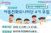 정안뉴스 안정주 기자 | 대구 달서구는 아동 정책에 대한 의견을 제시하고 아동권리 증진 활동에 참여할‘아동친화모니터단 4기’단원을 오는 27일까지 모집한다. 달서구 아동친화모니터단은 아동이 행복한‘아동친화도시 달서구’조성을 위한 아동참여기구로, 달서구에 주민등록을 둔 만 7세 이상 18세 미만의 초·중·고등학생 및 학교밖청소년이면 누구나 신청할 수 있다. 모집 인원은 30명 내외다. 공개모집 또는 기관 추천을 통해 선발된 단원들은 4월 위촉식을 시작으로 2년간 활동하며 ▲ 아동친화도시 조성을 위한 정책 제언, ▲ 아동권리 교육 및 캠페인 참여, ▲ 아동권리 모니터링 등 다양한 활동에 참여하게 된다. 달서구는 지난 2020년 1기 출범 이후 아동친화모니터단을 운영하며 아동이 지역사회 정책에 참여하고 아동 권리 증진 활동에 직접 참여할 수 있는 기회를 지속적으로 확대해 왔다. 참여를 희망하는 아동·청소년은 신청서를 작성해 달서구청 아동친화과로 방문 접수하거나 이메일로 제출하면 된다. 신청서 서식은 달서구청 홈페이지 또는 모집 포스터의 QR코드를 통해 내려받을 수 있다. 이태훈