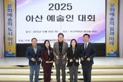 정안뉴스 황도연 기자 | 아산시의회 문화복지환경위원회는 지난 12월 20일 열린 ‘2025년 아산 예술인 대회’에서 지역 문화예술 발전에 기여한 공로를 인정받 아 감사패를 수상했다. 이번 행사는 (사)한국예술문화단체총연합회 아산지회 주관으로 개최됐으며, 한 해 동안 아산시 문화예술 발전을 위해 헌신해 온 예술인과 유관 단체 관계자들이 한자리에 모여 그 노고를 격려하고 화합을 다지는 뜻깊은 자리로 마련됐다. 이날 감사패는 이춘호 위원장을 비롯해 김은아 부위원장, 맹의석 의원, 천철호 의원, 김미성 의원에게 수여됐다. 문화복지환경위원회는 그동안 문화예술 분야 정책과 예산 심사 등을 통해 지역 예술인의 창작 환경 개선과 문화예술 기반 확충을 위해 지속적으로 노력해 왔으며, 이러한 의정활동 성과가 지역 문화예술계로부터 높이 평가받아 이번 수상으로 이어졌다. 문화복지환경위원회 위원들은 “아산 문화예술 발전을 위해 현장에서 묵묵히 헌신해 온 예술인 여러분께 깊은 감사의 말씀을 드린다”며 “앞으로도 예술인들의 창작 환경 개선을 위해 지속적으로 노력하겠다”고 밝혔다. 아산시의회 문화복지환경위원회는 앞으로도 시민