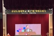 정안뉴스 황도연 기자 | 충남도립대학교 졸업생 344명이 배움의 시간을 마치고 지역과 사회를 향한 새로운 출발선에 섰다. 충남도립대학교는 11일 대학 해오름관 다목적실에서 ‘제27회 학위수여식’을 개최하고 전문학사와 학사 학위를 수여했다. 이날 행사에는 김태흠 충남도지사를 비롯해 정광섭 충남도의회 부의장과 도의원, 청양군수, 군의회 의장 등 주요 기관장이 참석했으며, 졸업생과 학부모, 교직원 등 450여 명이 함께해 졸업생들의 앞날을 축하했다. 무엇보다 올해 학위수여식은 도정을 책임지고 있는 김태흠 지사가 직접 참석해 졸업생 한 사람 한 사람의 출발을 응원했다는 점에서 의미를 더했다. 김태흠 지사는 격려사와 함께 전체 수석에게 표창을 수여하며 지역 인재에 대한 기대를 전했다. 김태흠 지사는 “충남도는 청년이 지역을 떠나지 않아도 되는 환경을 만들기 위해 산업과 일자리를 키우고 주거와 정주 여건을 지속적으로 개선하고 있다”며 “청년들이 이곳에 뿌리내리고 살아가며 미래를 설계할 수 있도록 기반을 더욱 단단히 다져 나가겠다”고 밝혔다. 그러면서 졸업생들에게 ‘수처작주(隨處作主)