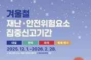 정안뉴스 황도연 기자 | 청양군은 겨울철 재난과 안전사고 예방을 위해 지난 1일부터 오는 2026년 2월 28일까지 약 3개월간 ‘겨울철 재난·안전 위험요인 집중신고기간’을 운영한다고 밝혔다. ‘안전신문고’는 국민 누구나 생활 주변의 각종 재난·안전 위험요인을 사진 또는 동영상으로 촬영해 신고할 수 있는 온라인 신고 시스템으로, 홈페이지와 모바일 앱을 통해 간편하게 이용할 수 있다. 이번 집중신고 기간은 겨울철에 특히 많이 발생하는 재난·안전사고를 사전에 예방하기 위해 마련된 것으로, 주요 신고 유형은 ▲대설 ▲한파 ▲화재 ▲축제·행사 등 4개 분야다. 대설 분야에서는 ▲도로 제설 미흡 ▲제설함 관리 불량 ▲시설물 붕괴 위험 등을, 한파 분야에서는 ▲인도 결빙 ▲고드름 낙하 ▲한파 쉼터 불편 사항을 신고할 수 있다. 또한 화재 위험과 관련해 ▲비상구 물건 적치 ▲담배꽁초 투기 ▲소화시설 불량 ▲불법 취사·소각 등을, 축제·행사 분야에서는 ▲인파 밀집 우려 ▲행사장 시설 파손 등을 신고 대상으로 하고 있다. 신고는 안전신문고 앱 또는 홈페이지에서 ‘겨울철 집중 신고’ 메뉴를 선택해 간편하