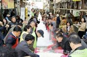 정안뉴스 황은경 기자 | 충북 단양군 단양구경시장에서 지역민과 관광객이 함께 어우러진 ‘제13회 가래떡데이 한마당 대축제’가 성황리에 열렸다. 지난 11일 단양구경시장 내 문화광장에서 열린 이번 행사는 단양구경시장상인회 주관으로 진행됐다. 올해로 13회를 맞은 가래떡데이 한마당은 지역 상권과 주민이 함께하는 소통과 나눔의 축제로 자리매김했으며, 300여 명의 주민과 관광객이 참여해 뜨거운 열기 속에 펼쳐졌다. 식전공연으로 아랑고고장구단의 힘찬 북소리가 울려 퍼지며 축제의 시작을 알렸고, 전통시장만의 흥겨운 정취 속에서 다채로운 프로그램이 이어졌다. 특히 단양시장의 명물인 ‘장보고북’ 타고 행사가 진행돼 눈길을 끌었다. ‘장보고북’은 북을 세 번 두드리면 소원이 이루어진다는 속설로 전해지며, 전통시장의 상징적인 볼거리로 자리잡고 있다. 이날의 하이라이트는 111m에 달하는 초대형 가래떡 커팅식이었다. 지역 주민과 관광객이 힘을 모아 가래떡을 뽑고 직접 나누며 웃음이 넘쳤고, 정성껏 준비한 따뜻한 떡을 함께 나누는 시간에는 박수와 환호가 이어졌다. 또한