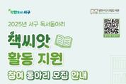 정안뉴스 기자 | 광주광역시 서구는 지역 주민의 독서 문화를 활성화하고 책을 통한 소통을 장려하기 위해 독서동아리 ‘책씨앗’참여팀을 모집한다. 모집 기간은 오는 16일까지며, 총 30개 동아리를 선발한다. 신청 대상은 서구에서 활동하는 5인 이상 독서동아리로, 월 1회 이상 정기 모임을 운영하는 팀이면 참여할 수 있다. 신청은 서구 통합도서관 누리집에서 신청서를 내려받아 작성한 후, 상록도서관 방문 또는 이메일로 제출 가능하다. 선정된 동아리에는 토론 도서와 모임 공간이 제공되며, 운영에 필요한 역량 강화 교육도 지원된다. 또한 ‘독서동아리 서평단’과‘문학의 밤 북콘서트’등 프로그램을 통해 작가와의 만남을 추진하는 등 독서 활동의 깊이를 더할 수 있도록 돕는다. 연말에는 우수 독서동아리를 선정하고, 회원들의 작품을 담은 문집 ‘책마중’을 제작해 배포할 계획이다. 이를 통해 동아리 활동의 기록을 남기고, 지역 사회에 독서 문화를 확산하는 데 기여할 것으로 기대된다. 한미 도서관과장은 “독서동아리는 단순히 책을 읽는 것을 넘어 서로의 생각을 나누고 소통하는 뜻깊은 활동이다”며 “자율적이고 적극적인 참