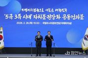 정안뉴스 안정주 기자 | 대한민국시장·군수·구청장협의회는 2월 26일 광주 국립아시아문화전당에서 민선8기 4차년도 제3차 공동회장단회의를 개최하고,『5극3특 시대 자치분권 강화 공동건의문』을 발표했다. 협의회 조재구 대표회장은 건의문을 통해“수도권 집중 극복과 지역 주도의 새로운 국가발전전략인 5극3특 균형성장 정책의 성패는 기초지방정부의 권한과 재정 확충에 달려 있다”고 했다. 이를 위해 그 초석이 되는 전남·광주 행정통합이 자치분권의 새로운 이정표로서, 지역성장과 경쟁력 강화의 모범모델로 자리매김 할 것을 강조하면서,“더 강화된 지방분권, 더 확대된 지방재정”을 위한 제도개선을 정부와 국회에 강력히 건의했다. 주요 건의내용은 ▲권한이양을 통한 기초지방정부 지방분권 강화 ▲지방교부세 확충과 보통교부세 자치구 직접 교부를 통한 지방재정의 확충 ▲국가균형성장 계획 및 정책 수립 과정에서 기초지방정부 협의 의무화 등이다. 한편, 협의회에 따르면 민선8기 후반기 대표적인 성과로 중앙지방협력회의에 기초지방정부 참여가 확대되어, 기존 대표회장 1명에서 시장․군수․구청장별 1명씩, 총 3명으로 확대될 예정
