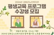 정안뉴스 안정주 기자 | 강화군노인복지관(관장 윤심)이 오는 12일~16일, 어르신들의 활기찬 노후와 평생학습 기회 확대를 위한 ‘2026년 평생교육 프로그램’ 수강생을 모집한다고 밝혔다. 2026년 평생교육 프로그램은 강화군에 거주하는 만 60세 이상의 어르신을 대상으로 진행되며 ▲건강 증진 6과목 12강좌 ▲교양교육 13과목 24강좌 ▲여가․취미 18과목 30강좌 ▲정보화 1과목 3강좌 ▲기획프로그램 6과목 9강좌 등 어르신들의 관심과 수요를 반영한 다양한 프로그램으로 구성된다. 노인복지관은 이번 프로그램을 통해 어르신들이 일상에서 배움을 이어가고 사회적 교류를 확대할 수 있도록 지원한다는 계획이다. 접수는 1월 12일~16일까지 진행되며, 강화군노인복지관으로 방문 접수가 가능하다. 모집인원 초과 시에는 공정성을 위해 컴퓨터 추첨을 통해 수강생을 선발할 예정이다. 2026년 평생교육 프로그램은 오는 2월 2일~12월 11일까지 운영될 예정이다. 윤심 관장은 “평생교육 프로그램은 단순한 여가 활동을 넘어 어르신들의 자기 계발과 사회참여를 돕는 중요한 역할을 지닌다”며, “많은 어르신이