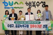 정안뉴스 안정주 기자 | 대구 수성구는 대구시 주관 2025 공공녹색제품 구매 평가에서 ‘최우수기관’으로 선정됐다고 밝혔다. 이번 평가는 대구시 9개 구·군을 대상으로 공공녹색제품 구매 실적(합동평가)을 통해 지속 가능한 소비문화 확산과 자원순환 활성화, 탄소중립 달성에 기여한 성과를 평가한 것이다. 수성구는 2024년 한 해 동안 전체 제품 구매액 대비 녹색제품 구매율 70%를 기록해 대구시 자치구 중 가장 높은 수치를 보였다. 이는 지난해 ‘우수기관’ 선정에 이어, 전 부서가 적극적으로 녹색제품을 구매하고 관리 체계를 공고히 한 협업의 성과다. 김대권 수성구청장은 “이번 최우수기관 선정은 수성구가 탄소중립 실현을 향한 확고한 의지를 보여준 성과”라며 “앞으로도 녹색제품 구매를 지속적으로 확대해 환경친화적 행정과 지속 가능한 미래를 선도해 나가겠다”고 말했다.