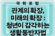 정안뉴스 안정주 기자 | 6 3 지방선거를 앞두고 다양한 청년정책이 발표되는 가운데, 청년 당사자가 직접 청년정책으로서 생활동반자법의 의미와 필요성을 조망하는 국회포럼이 개최된다. 이날 포럼에는 50여 명의 청년 당사자가 참석해 생활동반자법에 대한 의견을 나눌 예정이다. 기본소득당 용혜인 의원과 기본소득당 청년 대학생위원회는 4월 5일 오후 2시 국회의원회관 제3세미나실에서 '관계의 확장, 미래의 확장 : 청년이 감각하는 생활동반자법' 국회포럼을 개최한다. 용혜인 의원은 지난 1월 세상을 바꾸는 청년 캠페이너를 양성하는 ‘링크로스 아카데미’ 3기를 개최하고, 우수 참가자를 대학생특보로 위촉했다. 이번 국회포럼은 대학생특보가 청년 당사자로서 청년에게 필요한 제도 변화를 모색하며, 직접 포럼 기획과 진행을 맡았다. 이번 포럼에서는 용혜인 의원이 직접 위촉한 대학생특보 6인(김다희, 김서현, 나하은, 오채은, 이루리, 한빛나)이 여는 발제를 맡아, 청년의 삶에서 생활동반자법이 가지는 의미를 설명한다. 토론으로는 은둔고립청년 자조모임센터 '두더집' 운영자인 김예림 씨즈 전문위원, 이호림 무지개행동 공동대