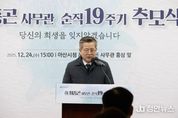 정안뉴스 황도연 기자 | 아산시는 24일, 아산시청 앞 故 최종곤 사무관 흉상 앞에서 ‘故 최종곤 사무관 순직 19주기 추모식’을 거행했다. 이번 추모식은 2006년 12월, 공무 수행 중 불의의 사고로 순직한 故 최종곤 사무관의 숭고한 희생과 헌신을 기리고, 시민의 안전을 위해 헌신한 공직자의 사명과 책임을 되새기기 위해 마련됐다. 이날 행사에는 유가족을 비롯해 김범수 아산시 부시장, 맹의석 아산시의회 부의장, 동료 공직자 등 다수가 참석해 고인을 추모했다. 김범수 부시장은 추모사에서 “故 최종곤 사무관은 시민의 안전을 자신의 책무로 여기며 현장에서 묵묵히 소임을 다한 참된 공직자였다”며 “고인의 희생과 헌신은 오늘의 아산시 공직자들에게도 큰 울림과 책임으로 남아 있다.”고 말했다. 이어 “아산시는 고인의 뜻을 잊지 않고, 시민의 안전을 최우선으로 하는 행정을 이어 가겠다”고 밝혔다. 故 최종곤 사무관은 2006년 12월 24일, 송악면 국도 39호선에서 조류인플루엔자 확산 방지 업무를 수행하던 중 과속 차량에 의해 사고를 당해 순직했다. 고인은 생전 성실한 근무와 투철한 책임감으로 동료와 시민들