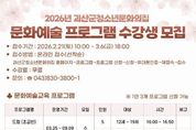 정안뉴스 황은경 기자 | 충북 괴산군청소년문화의집이 청소년들의 창의적 역량과 전인적 성장을 지원하기 위한 ‘2026년 문화예술 프로그램’ 수강생을 모집한다고 20일 밝혔다. 이번 프로그램은 청소년들이 문화·예술·체육·학습 분야의 다양한 활동을 경험하며 자기표현 능력과 정서적 안정, 건강한 여가문화를 형성할 수 있도록 기획됐다. 강좌는 예술, 체육, 학습 분야 등 총 10개 과정으로 구성됐다. 세부 프로그램으로는 △드럼 △바이올린 △발레 △댄스 등 예술 강좌와 △요리 △포켓볼 △탁구 등 체험·체육 강좌, 그리고 △생명과학 △주산 △기초학습&보드게임 등으로 구성돼 청소년들의 선택 폭을 넓혔다. 특히 ‘기초학습&보드게임’ 프로그램은 대청교(대학생 청소년 교육 멘토링)와 함께 운영된다. 국어·수학·영어 등 교과 중심 학습지도와 보드게임을 병행하고 정서 멘토링 활동도 함께 진행해 학습 흥미와 자신감을 높일 계획이다. 수강 신청은 오는 21일부터 3월 6일까지며 괴산군청소년문화의집 홈페이지를 통해 선착순으로 진행된다. 박은순 가족행복과장은 “이번 문화예술 프로그램을 통해