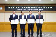 정안뉴스 황은경 기자 | 충주시는 31일 시청 중회의실에서 2027년 하계세계대학경기대회의 성공적인 개최와 문화예술 발전을 위해 국립한국교통대학교, 건국대학교 글로컬캠퍼스, 충주시체육회와 공식 업무협약을 체결했다. 이번 협약은 지역 주요 체육관과 충주문화회관의 리모델링 공사로 경기장과 문화시설 활용이 일시적으로 제한됨에 따라, 지역 대학교 시설을 비롯한 각종 지원 협력을 공식화하기 위해 마련됐다. 협약식에는 조길형 충주시장, 윤승조 국립한국교통대학교 총장, 최영근 건국대학교 글로컬캠퍼스 부총장, 진용섭 충주시체육회장 등이 참석해 전문체육 및 생활체육 활성화, 문화예술 발전 등을 위한 협력 강화, 협약 기관 간 인적 인프라 지원 등 다양한 분야에서 협력하기로 뜻을 모았다. 협약을 통해 각 기관의 체육관 등 시설 대관 시 적극적인 협조를 받고, 주요 행사 진행 시 기관 간 자원봉사 등 인프라 지원이 이뤄질 것으로 기대된다. 조길형 시장은 “2027년 U대회 성공 개최와 문화예술 발전을 위해 모두가 한 데 힘을 모으는 좋은 계기가 마련됐다”라며, “이번 U대회는 대학생들과 지역사회 모두가 어우러져 함께