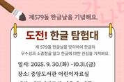 정안뉴스 안정주 기자 | 인천광역시교육청중앙도서관은 제579돌 한글날을 맞아 9월 30일부터 10월 31일까지 어린이들이 즐겁게 한글을 배우고 도서관을 체험할 수 있는 특별행사 ‘도전! 한글 탐험대!’를 운영한다. 이번 행사는 어린이자료실에서 진행하며, 어린이들이 비치된 문제지를 풀며 한글의 독창성과 우수성을 체험할 수 있도록 준비했다. 문제는 어린이 눈높이에 맞춰 쉽고 재미있게 구성했으며, 3문제 이상을 맞히면 소정의 기념품을 받을 수 있다. 자세한 사항은 중앙도서관 누리집 또는 어린이자료실로 문의하면 된다.