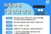 정안뉴스 황도연 기자 | 천안시 동남구는 내달 16~ 31일 자동차세 연납 신청을 받는다고 27일 밝혔다. 매월 6월과 12월 정기적으로 부과되는 자동차세를 미리 납부하면 세금 할인 혜택을 받을 수 있다. 3월에 연납 신청할 경우 4~ 12월에 대한 세액의 5%(연세액의 약 3.7%)를 공제받을 수 있다. 신청 대상자는 천안시 동남구에 등록된 모든 차량 소유자로, 기간 내에 신청해야 할인 혜택을 받을 수 있다. 신청은 구청 세무과·읍면동 행정복지센터 방문, 전화, 위택스를 통해서 가능하다. 납부는 전국 모든 은행 CD/ATM, 위택스·인터넷지로, 가상계좌 이체 중 편리한 방법으로 하면 된다. 한익희 세무과장은 “지난달 연납 신청 기회를 놓친 시민분들께서는 3월 신청 기간을 적극 활용해 세금 절감 혜택을 누리시길 바란다”고 말했다.