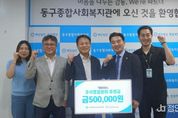 정안뉴스 황정혜 기자 | 부산 동구, 동구종합사회복지관은 근로복지공단 부산지역본부에서 10월 1일 추석 명절을 앞두고, 동구 지역 소외계층에게 힘이 될 수 있도록 50만 원의 후원금을 동구종합사회복지관에 전달했다고 밝혔다. 해당 성금은 동구 지역 내 취약계층의 추석 명절맞이 지원으로 활용될 예정이다. 이외에도 근로복지공단 부산지역본부에서는 임직원들이 매주 수요일마다 복지관 4층 장난감도서관을 방문해 어린아이들이 안전하게 놀 수 있도록 장난감 소독 봉사활동에 꾸준히 참여하고 있다. 민병창 근로복지공단 부산지역본부장은 “어른, 아이 할 것 없이 모두가 행복하고 즐거운 동구가 될 수 있도록 앞으로도 다양한 활동을 통해 사회공헌사업을 이어나가겠다” 고 밝혔다.