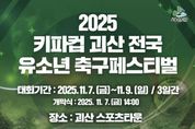 정안뉴스 황은경 기자 | 충북 괴산군은 오는 11월 7일부터 9일까지 3일간 괴산스포츠타운과 청소년수련원 축구장에서 ‘2025 자연울림괴산 전국 유소년축구대회’를 개최한다고 30일 밝혔다. 이번 대회는 (사)한국유소년축구협회와 괴산군체육회가 공동 주최하고, (사)한국유소년축구협회 및 괴산군축구협회가 주관한다. 전국 각지에서 총 70개 팀, 선수 및 임원, 학부모 등 2,000여 명이 참가할 예정이다. 특히 7일 오후 2시에는 괴산스포츠타운 준공식과 함께 개막식이 열리며, 개막 이후 첫 경기로는 괴산군 대표팀인 강호FC가 출전해 대회의 시작을 알린다. 경기는 학년별로 나뉘어 진행된다. 초등 1~3학년부는 6인제, 4~6학년부는 8인제 방식으로 운영되며, 경기의 공정성과 안전성을 확보하기 위해 전문 심판진과 운영 요원이 배치된다. 대회 우승팀에게는 필리핀 뉴클락시티에서 열리는 국제대회 및 동계 해외전지훈련 무상 참가 자격이 주어지며, 이를 통해 선수들이 국제무대 경험을 쌓고 기량을 향상시킬 수 있을 것으로 기대된다. 또한, 이번 대회는 단순한 스포츠 행사를 넘어 지역경제 활성화