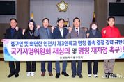 정안뉴스 안정주 기자 | 중구의회는 18일 본회의장에서 중구민의 뜻을 외면한 인천시의 제3연륙교 명칭 졸속 결정을 강력 규탄하며, ‘국가지명위원회 재심의 및 명칭 재지정’을 촉구하는 성명서를 발표했다. 인천시는 지난 12일, 중구와 서구의 재심의 요청을 반영한 ‘인천광역시 지명위원회’ 회의에서 제3연륙교의 명칭을 ‘청라하늘대교’로 재의결했다고 발표했다. 그러나 중구의회는 “이번 결정은 지역 간 형평성과 중구민의 의견을 충분히 반영하지 못하고 영종 지역의 상징성을 배제한 일방적인 결정”이라며 수용할 수 없다는 입장이다. 중구의회는 “제3연륙교는 유료도로로 인한 이동 제한 속에서도 불편과 불합리함을 감내하며, 영종지역 주민들이 건설 비용까지 부담한 소중한 결실”이라며 “생계유지 등 일상 활동을 위해 해당 교량을 가장 많이 이용하게 될 주 이용자가 영종지역 주민들이란 점을 고려할 때 명칭에 영종 주민들의 권리와 지역 정체성을 반영하는 것이 더 타당하고 자연스럽다”고 강조했다. 또한, “섬과 육지를 연결하는 연륙교의 명칭은 강화대교, 무의대교 등과 같이 섬의 이름을 따르는 것이 관례임에도 인천시는 ‘청라하늘대교’라는
