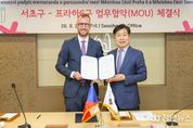 정안뉴스 안정주 기자 | 서울 서초구는 지난 26일 구청 5층 대회의실에서 체코 프라하 6구와 문화, 예술, 교육 분야 등 상호 교류 우호증진을 위한 우호도시협정 양해각서(MOU)를 체결했다고 밝혔다. 프라하 6구는 체코 프라하에서 가장 넓은 행정구역으로, 바츨라프 하벨 국제공항과 체코 공과대학교, 각국 대사관과 주체코 한국대사관이 위치하고 있다. 또 한인 교민이 가장 많이 거주하는 지역으로 서울시 25개 자치구 중 가장 안전하고 살기 좋은 도시로 알려진 서초구와 많은 공통점을 지닌 도시다. 이번 협약을 위해 지난 6월 말 전성수 구청장을 비롯한 대표단은 체코 프라하 6구를 방문해 야쿱 스타렉 구청장과 간담회를 갖고 문화·교육 등 다양한 분야에서 지속 가능한 협력 방안을 폭넓게 논의한 바 있다. 구는 이번 협약을 계기로 프라하 6구와의 교류를 본격적으로 확대해 한·체코 간 미래지향적 파트너십 구축에 기여해 나간다는 계획이다. 또 이번 방문 기간 중 프라하 6구 대표단은 9월 27일부터 28일까지 열리는 서초구 대표축제인 ‘서리풀뮤직페스티벌’에 참여한다. 아울러 양재천에 설치된 ‘바츨라프 하벨 벤치’