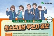 정안뉴스 안정주 기자 | 대구광역시는 건강하고 바른 성장으로 지역사회의 귀감이 된 청소년을 발굴·포상하기 위해 ‘2026년 제38회 대구광역시 청소년대상’ 후보자를 2월 24일부터 3월 20일까지 공개 모집한다. 1989년 첫발을 내디딘 ‘청소년대상’은 건강하고 올바른 청소년 상(像) 정립을 위해 매년 각 분야의 모범 청소년을 시상해 왔다. 지난해까지 총 250명(대상 36명, 우수상 111명, 장려상 103명)의 수상자를 배출하며 지역을 대표하는 청소년 포상으로 자리 잡았다. 후보자 자격은 공고일(2.23.) 현재 대구시에 1년 이상 계속 거주하고 있는 만 9세 이상 24세 이하 청소년으로, 구청장·군수, 학교장, 청소년 관계기관장 등의 추천을 통해 접수할 수 있다. 시상 부문은 △선행효행 △창의인재 △푸른성장 3개 분야며, 선정 인원은 대상 1명을 포함해 각 부문별 우수상 1명, 장려상 1명씩 총 7명이다. 대상은 수상 후보자 중 여러 면에서 성품과 행동이 가장 훌륭해 모든 청소년의 귀감이 되는 청소년에게 수여된다. 선행효행 부문은 지역사회를 위한 봉사활동 중 선행을 하거나, 부모에