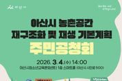정안뉴스 황도연 기자 | 아산시는 '농촌공간 재구조화 및 재생 기본계획' 수립과 관련해 지역 주민과 관계 전문가의 의견을 수렴하기 위한 주민공청회를 오는 3월 4일 오후 2시, 아산시 청소년교육문화센터 1층 스마트홀(시민로 500)에서 개최한다. 이번 기본계획은 아산시 2개 읍·9개 면을 공간적 범위로 하고, 2026년부터 2035년까지 10년간을 계획기간으로 수립되는 법정계획이다. 농촌공간의 체계적 기능 재편과 생활여건 개선을 목표로, 지역 특성을 반영한 중장기 발전 방향을 제시할 예정이다. 공청회에서는 △계획 개요 △현황 및 여건 분석 △재구조화 및 재생 기본구상 △부문별 계획 등을 발표하고, 토론과 질의응답을 통해 주민 및 전문가 의견을 폭넓게 수렴할 계획이다. 시는 공청회에서 제시된 의견을 종합해 아산시 농촌공간정책심의회 심의와 농림축산식품부 및 충청남도와 협의 과정에 반영할 방침이다. 기본계획(안)에 의견이 있는 주민은 3월 13일 오후 6시까지 전자우편 또는 우편으로 의견서를 제출하거나, 공청회에 참석해 질의응답 시간에 직접 의견을 제시할 수 있다.