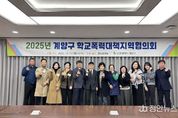 정안뉴스 안정주 기자 | 인천광역시 계양구는 지난 17일 구청 영상회의실에서 ’계양구 학교폭력대책지역협의회‘를 개최했다고 밝혔다. 계양구 학교폭력대책지역협의회는'인천광역시 계양구 학교폭력예방 및 대책에 관한 조례'에 따라 학교폭력 예방 대책을 수립하고 기관별 상호 지원 방안을 협의하는 위원회로 위원장은 부구청장이며 총 13명의 위원이 참여하고 있다. 이번 회의에는 구 의회, 교육청, 경찰서, 보호관찰소 등 유관 기관 관계자들뿐만 아니라 녹색어머니연합회, 학교 운영위원회 소속 학부모까지 심의 위원으로 참석해 학교 폭력 예방과 해결을 위한 지역사회와 학부모의 상호 협력 속 다양한 의견을 교환했다. 위원장인 이동우 부구청장은 “이번 회의에서 논의된 다양한 의견들을 반영해 실효성 있는 학교폭력 예방 대책을 추진할 계획이며, 앞으로 청소년들이 더 안전한 환경에서 걱정 없이 성장할 수 있도록 노력하겠다.”라고 말했다. 한편, 구는 앞으로도 관계 기관과 협력을 강화하고 실질적 대응 체계를 구축해 학교폭력 이전부터 사후 회복까지 지역사회 중심의 통합 지원을 제공할 계획이다.