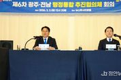 정안뉴스 안정주 기자 | 광주광역시와 전라남도는 2일 전남 나주시 뉴나주씨티호텔에서 ‘광주전남 행정통합 추진을 위한 제6차 추진협의체 회의’를 개최했다. 이번 회의에는 강기정 광주시장과 김영록 전남지사를 비롯해 양 시·도 공동위원장, 추진협의체 위원 등 20여명이 참석했다. 회의에서는 지난달 30일 국회에 발의된 ‘전남광주 통합특별시 설치를 위한 특별법안’의 주요 내용 공유와 국회 심의 대응 방안, 향후 추진 일정 등을 중심으로 심도 있는 논의가 이뤄졌다. 특별법안은 광주광역시와 전라남도를 하나의 통합특별시로 설치하기 위한 법적 근거를 마련하는 것으로, 통합특별시의 지위와 권한, 행정·재정 특례, 국가 지원 사항 등 387개 조문(375개 특례)으로 구성돼 있다. 인공지능·에너지·문화수도를 비전으로, 첨단산업 육성, 국가 기간산업 경쟁력 강화, 농어촌의 균형 있는 발전 등을 담아 수도권에 대응하는 남부권 성장 축으로 육성하겠다는 의지를 명확히 하고 있다. 이번 회의는 국회 특별법 발의 이후 처음 열리는 추진협의체 회의로, 특별법 통과까지 광주전남의 핵심 특례사항이 충실히 반영될 수 있도록 대응 방안
