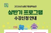 정안뉴스 안정주 기자 | 인천시 남동구 평생학습관은 구민의 자기 계발과 지적 성장을 위해 오는 24일부터 ‘2026년 상반기 평생학습 프로그램’ 학습자를 모집한다고 20일 전했다. 상반기 프로그램은 3~5월까지 운영되며, 일상의 활력을 더하고 실질적인 역량을 강화할 수 있는 실용적인 강좌들로 꾸려졌다. 특히, ‘2025년 평생교육 강사학교’ 과정을 이수한 강사들이 지역사회와 시민의 삶을 주제로 직접 기획⋅개발한 강좌들이 다수 개설됐다. 주요 강좌로는 ▲남동구의 색(色)다른 이야기 ▲나의 감정을 안아주는 예술이야기 ▲생성형 AI로 만드는 나의 영상 콘텐츠 ▲그림책과 공예 테라피로 나를 찾는 ‘다시, 봄’ 등 모두 4개 과정이 운영된다. 이와 함께 전 연령층의 학습 수요를 반영한 다양한 강좌도 운영된다. ▲시니어(65+) 스마트폰 입문 클래스 ▲바리스타 2급 자격과정 ▲오뒷세우스 깊게 읽기 ▲장애인과 비장애인이 함께하는 생태탐방 등 실용성과 인문적 소양을 아우르는 프로그램이 준비돼 있다. 수강 신청은 남동구평생학습관 홈페이지에서 선착순으로 진행되며, 남동구민 또는 남동구 내 직