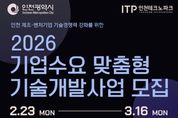 정안뉴스 안정주 기자 | 인천테크노파크(인천TP)는 지역 제조벤처기업의 기술경쟁력 강화를 위해 ‘2026년 기업수요 맞춤형 기술개발사업’의 참여기업을 오는 3월 16일까지 모집한다고 밝혔다. 이번 사업은 인천 소재 제조벤처기업 중, 최근 5년 이내에 민간 액셀러레이터(AC)나 벤처캐피탈(VC) 등 적격 투자기관으로부터 투자를 유치한 기업을 대상으로 한다. 총 6개 내외의 과제를 선정해 기업당 최대 7,500만 원의 기술개발비를 지원할 계획이다. 지원금은 신규 채용 인건비, 전문가 활용비, 시제품 제작 및 성능 시험·평가 등 사업화와 상용화에 필요한 제반 비용으로 활용할 수 있다. 특히 선정 기업은 스케일업TIPS 운영사를 통해 지식재산권(IP) 경영진단 등의 컨설팅을 받게 된다. 이 중 성과가 우수한 기업은 스케일업TIPS 운영사로부터 10억 원 규모의 직접 투자와 함께 스케일업TIPS 프로그램 추천 기회를 얻을 수 있다. 최종적으로 스케일업TIPS에 선정되면 향후 3년간 총 20~30억 원의 R·D 자금을 후속 지원을 받을 수 있다. 사업 신청은 3월 16일