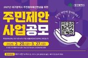 정안뉴스 안정주 기자 | 대구광역시는 시민의 목소리를 시정에 직접 반영하기 위해 2월 20일부터 3월 27일까지 36일간 ‘2027년도 예산편성을 위한 주민제안사업’을 공모한다. 이번 공모 규모는 총 140억 원 규모로, 공모 분야는 ▲시정 참여형(70억 원) ▲구·군 참여형(40억 원) ▲읍·면·동 참여형(30억 원) 등 총 3개 부문으로 나뉜다. 대구 시민은 물론 대구 소재 직장인과 학생이라면 누구나 참여할 수 있다. 다만, 대구시와 구·군 공무원 및 산하 출연·투자기관에 종사하는 사람은 제외된다. 제안은 주민참여예산 누리집과 이메일, 팩스, 우편 및 방문 접수를 통해 가능하다. 대구시는 참여자 가운데 추첨을 통해 모바일 상품권을 지급하며, 향후 투표를 통해 우수사업으로 선정된 제안자에게는 대구광역시장 표창을 수여할 계획이다. 접수된 사업은 사업부서 검토와 주민참여예산위원회의 숙의·심사, 주민투표 및 총회 승인을 거쳐 선정되며, 시의회 예산심의·의결을 통해 2027년 주민참여예산 사업으로 최종 확정된다. 한편, 대구시는 지난해 주민제안사업 공모를 통해 ▲불로고분공원