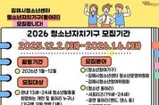 정안뉴스 김재홍 기자 | 김해시청소년센터는 2026년 청소년자치기구(동아리)를 모집한다고 27일 밝혔다. 모집 분야는 ▲청소년정책에 주체적으로 참여할 수 있는 청소년참여위원회와 ▲김해시청소년센터의 운영에 대한 참여와 모니터링을 수행하는 청소년운영위원회 ▲공연, 비공연 등 3명 이상의 동아리 기능을 수행할 수 있는 단체 또는 개별 동아리이다. 자치(동아리) 활동에 관심이 있는 13세부터 24세 청소년은 누구나 지원할 수 있으며 12월 2일부터 2026년 1월 6일까지 신청 QR코드를 이용해 신청서를 제출하면 된다. 선정 발표는 내년 1월 14일 누리집 공지하고 개별 연락한다. 센터 관계자는 “다양한 활동과 관계 증진을 통한 건전한 가치관을 확립하고 자기계발 기회를 확대할 수 있도록 적극 지원하겠다”고 말했다. 보다 자세한 내용은 누리집을 참고하고 문의는 김해시청소년센터로 하면 된다. 한편 김해시청소년센터는 청소년들이 더 나은 환경에서 성장할 수 있도록 12월 말 시설 리모델링을 앞두고 있다. [뉴스출처 : 경상남도김해시]