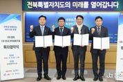 정안뉴스 안정주 기자 | 최근 세계적으로 각광 받는 AI(인공지능) 분야의 전문기업과 에너지 솔루션 기업이 전주에 둥지를 틀기로 했다. 전주시와 전북특별자치도, 전북연구개발특구는 16일 전북특별자치도청에서 탄소국가산단과 전북테크비즈센터 입주를 희망하는 (유)한국기계설비기술(대표 하정성)과 ㈜모레(대표 조강원) 등 2개 기업과 총 356억 원 규모의 투자협약을 체결했다. 이날 협약식에는 우범기 전주시장과 김관영 전북특별자치도지사, 유진혁 전북연구개발특구 본부장, 하정성 (유)한국기계설비기술 대표, 조강원 (주)모레 대표 등이 참석했다. 투자기업 중 (유)한국기계설비기술은 광주광역시에 소재한 스마트 설비제어 및 에너지 효율 솔루션 전문기업으로, 전주탄소국가산단에 150억 원을 투자해 제조시설을 신축하고, 총 40명 규모의 신규 일자리를 창출키로 약속했다. 시는 에너지 효율 솔루션 전문기업이 전주에 둥지를 틀면, 에너지자립 추진을 위해 ‘스마트그린 국가시범 산업단지’로 지정된 탄소국가산단과의 시너지 효과를 거둘 수 있을 것으로 기대하고 있다. 또한 투자기업 중 서울특별시에 소재한 ㈜모레는 A