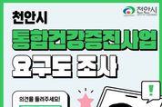 정안뉴스 황도연 기자 | 천안시는 오는 28일까지 내년 지역사회 통합건강증진사업 추진을 위한 주민요구도 조사를 실시한다고 6일 밝혔다. 시는 내년 지역사회 통합건강증진사업 계획 수립 시 사업의 우선순위와 핵심성과 지표 선정 등 시민의 의견을 반영하기 위해 주민요구도 조사를 실시한다. 조사는 인적사항을 비롯해 건강증진사업에 대한 인식도·참여도·만족도·사업의 우선순위 등 총 12문항으로 구성돼 있으며, 정보무늬(QR코드)를 통해 비대면으로 참여하면 된다. 기타 문의사항은 천안시 동남구보건소 건강생활팀으로 문의하면 된다. 이현기 서북구보건소장은 “천안시민의 건강 수준 향상을 위한 지역사회 통합건강증진사업에 시민들의 요구사항이 최대한 반영될 수 있도록 시민들의 적극적인 참여를 바란다”고 말했다.