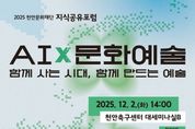정안뉴스 황도연 기자 | 천안문화재단은 내달 2일 천안축구센터에서 ‘2025 천안문화재단 지식공유포럼’을 개최한다고 6일 밝혔다. 이번 포럼은 ‘AI✕문화예술 : 함께 사는 시대, 함께 만드는 예술’을 주제로 인공지능(AI)의 급속한 발전이 우리의 삶과 문화예술에 미치는 영향을 살펴보고, 변화하는 환경 속에서 예술의 새로운 방향을 모색하기 위해 마련됐다. 포럼 1부에서는 김윤경 한국문화관광연구원 부연구위원이 ‘AI시대 문화예술계 변화와 현장 대응 전략’을, 김지현 중부대학교 사진영상학과 교수가 ‘예술가의 AI 창작 실험 및 제작 사례’를 주제로 발제한다. 이어 2부에서는 허대찬 미디어문화예술채널 앨리스온 편집장과 이지용 단국대학교 글로벌 K-컬처 인문사회융합인재단 교수, 최수웅 단국대학교 문예창작과 교수가 참여해 ‘AI와 예술의 공존’에 대해 토론을 진행할 예정이다. 이번 포럼을 통해 AI 시대의 예술 창작과 유통·향유 방식의 변화를 살피고, 지역 문화생태계의 미래 방향을 고민하는 자리가 될 것으로 기대하고 있다. 포럼은 무료로 진행되며, 참가를 희망하는 시민은 재단 누리집 또는 네이버