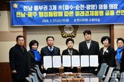 정안뉴스 안정주 기자 | 여수시의회는 27일 오후 3시 순천시의회 의장실에서 강형구 순천시의회 의장, 최대원 광양시의회 의장과 함께 '전남·광주 행정통합에 따른 전남동부권(여수·순천·광양) 미래경제동맹 공동선언문'을 발표했다. 이번 공동선언은 전라남도와 광주광역시의 행정통합 논의가 진행되는 가운데, 전남동부권이 국가 산업·에너지·물류 거점으로서 수행해 온 역할과 향후 기능이 통합 과정에서 반드시 반영돼야 한다는 데 3개 시의회 의장이 뜻을 모으며 마련됐다. 3개 시의회 의장은 공동선언을 통해 전남·광주 행정통합이 수도권 일극체제 완화와 국가균형발전을 위한 계기가 돼야 하며, 단순한 행정구역 개편을 넘어 산업·교통·에너지·물류·인재 정책을 연계하는 초광역 경제권 형성으로 이어져야 한다는 점을 강조했다. 아울러 행정통합 이후 정책과 재정, 대규모 국책사업이 광주권과 전남 서부권에 집중될 가능성에 대해 우려를 표하며, 전남동부권의 산업적 위상과 기능이 통합 논의 전반에 균형 있게 반영돼야 한다는 입장을 분명히 했다. 여수·순천·광양 3개 시의회 의장은 공동선언을 통해 ▲전남동부권의 국가산업 거점 기능과