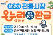 정안뉴스 안정주 기자 | 파주시는 2026년 설 명절을 맞아 고물가로 인한 시민들의 가계 부담을 덜고 지역 전통시장 활성화를 도모하기 위해 ‘설맞이 농축산물 온누리상품권 환급 행사’를 실시한다. 이번 행사는 농림축산식품부가 주관하는 ‘농축산물 할인지원’사업의 일환으로, 본격적인 제수용품 구매 기간인ق월 10일부터 14일까지 5일간 관내 전통시장 2곳(봉일천전통시장, 금촌전통시장)에서 진행된다. 행사 기간 동안 참여 점포에서 국산 농축산물을 구매한 고객은 구매 금액에 따라 1만 원 또는 2만 원 상당의 온누리상품권을 환급받을 수 있다. 환급 기준은 ▲구매 금액이 3만 4천원 이상 6만 7천 원 미만일 경우 1만 원 ▲6만 7천 원 이상일 경우 2만 원이며, 환급 한도는 1인당 최대 2만 원이다. 단, 예산 소진 시 행사는 조기 종료될 수 있다. 환급을 희망하는 고객은 당일 구매 영수증과 신분증을 지참해 각 시장 내에 마련된 지정 환급처를 방문하면 된다. 환급 대상 품목은 국산 농산물 및 축산물이며, 수입산 농축산물이나 법인카드 결제 내역, 제로페이 모바일 상품권 결제 내역 등은 환급 대상에서 제외된다