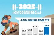 정안뉴스 안정주 기자 | 문화체육관광부는 만 10세 이상인 국민 9천 명을 대상으로 시행한 ‘2025년 국민생활체육조사’ 결과를 발표했다. 2025년 생활체육 참여율(주 1회, 30분 이상)은 62.9%로, 전년 대비 2.2%포인트(p) 상승했다. 특히 주 2회 이상 참여율은 52.2%로 2.7%포인트(p) 증가했다. 연령대별로는 20대부터 60대까지의 참여율은 65% 내외로 비교적 고르게 나타났으나, 10대(43.2%)와 70대 이상(59.5%)은 다른 연령대에 비해 낮은 수준을 보였다. 주요 참여 종목은 걷기(40.5%), 보디빌딩(17.5%), 등산(17.1%) 순으로 나타났다. 이 중 등산은 전년 대비 5.0%포인트(p) 증가해 참여 비중의 증가 폭이 가장 컸다. 주로 참여하는 체육활동(1+2+3순위) 1회 평균 참여 시간은 ‘1시간~1시간 30분 미만’이라고 응답한 비율이 67.3%로 가장 높았다. 최근 1년간 체육활동 참여 기간이 ‘9개월 이상’이라고 응답한 비율은 91.4%였다. 규칙적 참여자의 평균 참여 기간은 14개월로, 전년(11개월) 대비 증가한 것으로 나타났다. 체육활동 장소로