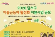 정안뉴스 안정주 기자 | 대구 달서구는 주민이 스스로 마을에 필요한 사업을 발굴하고 실행하는 ‘2026년 마을공동체 활성화 지원사업’ 참여자를 2월 13일까지 모집한다. 올해로 7년째를 맞는 달서구 마을공동체 활성화 지원사업은 2020년부터 현재까지 총 79건의 사업을 지원해 왔으며, 탄소중립 실천, 공동텃밭, 공동육아, 소외계층 돌봄, 마을축제 등 다양한 분야에서 주민 주도의 마을문제 해결과 공동체 기반 확충에 기여하고 있다. 이번 공모는 총 3개 분야로 15개팀 내외를 선정해 공동체 역량과 사업 성격에 따라 단계별로 사업비를 지원한다. 지원 규모는 ▲ 신규 공동체를 위한 ‘신참마을’ 200만원 이내 ▲ 경험 있는 공동체를 위한 ‘도약마을’ 300만원 이내 ▲ 마을축제 등을 위한 ‘주민화합행사’ 500만원 이내이다. 신청 자격은 5인 이상 달서구 주민 모임 또는 단체이며, ‘주민화합행사’는 10인 이상이 참여해야 한다. 또한 교육·환경·복지·안전·문화 등 마을에 필요한 다양한 분야에서 다수 주민이 공감하고 함께 참여할 수 있는 공익성 사업이어야 한다. 신청 서식과 자세한