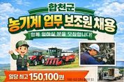 정안뉴스 김재홍 기자 | 합천군은 농기계대여은행 운영체계를 강화하고 농업인 영농 편의를 높이기 위해 2026년 농기계 업무보조원 기간제근로자 9명을 채용한다고 14일 밝혔다. 이번 채용은 기간제근로자의 처우 개선을 통해 안정적인 일자리를 제공하고, 이를 바탕으로 농기계대여은행 이용 농업인들의 영농 편의를 실질적으로 향상시키기 위한 정책의 일환으로 추진된다. 채용 인원은 9명(기술직 8명, 민원응대 1명)이며, 선발된 인원은 농기계대여은행에서 농기계 입·출고 관리, 배송 지원, 임대장비 유지·관리 및 기초 점검, 농기계 순회 안전(수리)교육 지원, 농업인 민원 응대 등 현장 밀착형 업무를 수행하게 된다. 특히 합천군은 업무 숙련도와 전문성을 보수에 반영하는 기술등급별 임금체계를 적용해(99,910원/일~150,100원/일, 복리후생 수당 30만원/월), 농기계 정비수리 실기평가 결과에 따라 차등 지급함으로써 능력과 책임에 상응하는 합리적인 보상체계를 마련했다. 이를 통해 근로자의 근무 안정성과 책임성을 높이고, 서비스 품질 향상으로 이어지는 선순환 구조를 만든다는 방침이다. 채용 대상자는 농기계