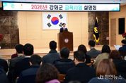 정안뉴스 안정주 기자 | 강화군은 지역 인재 양성과 공교육 경쟁력 강화를 위해 2026년도 교육경비 지원사업에 총 29억 원의 예산을 편성하고, 12일 인천광역시교육청 및 관내 학교 관계자 등을 대상으로 ‘2026년 교육사업 설명회’를 개최했다. 교육경비 지원사업은 강화군이 지속적으로 확대해 온 대표적인 교육 지원 정책으로, 타 지자체와 비교해도 높은 수준의 교육투자를 이어가고 있다. 군은 방과 후 학교 프로그램, 창의적 체험활동, 진로·진학 프로그램, 명문고 육성, 방학 중 중식비 지원 등 학교별 특성과 수요에 맞춘 다양한 교육 프로그램 운영을 지원함으로써 농어촌 지역의 교육격차 해소와 공교육 경쟁력 강화를 도모하고 있다. 이번 설명회는 이 같은 교육경비 지원사업의 세부 추진 방향과 신청 절차를 안내하고, 학교 현장의 이해를 높이기 위해 마련됐다. 아울러 군에서 활발하게 추진하고 있는 청소년 국제교류 사업에 대한 설명도 함께 진행됐다. 설명회는 1부와 2부로 나뉘어 진행됐으며, 관내 교육 관계자 80여 명이 참석해 높은 관심을 보였다. 1부에서는 2026년 교육경비 지원사업 설명회를