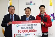 정안뉴스 황은경 기자 | 충북도는 23일 대한전문건설협회 충북도회에서 희망나눔 성금 1천만 원을 기탁했다고 밝혔다. 기탁식은 김영환 충북도지사, 류근형 대한전문건설협회 충북도회장, 김현호 수석부회장 및 정동의 충북사회복지공동모금회 사무처장 등이 참석한 가운데 진행됐다. 이번에 기탁된 성금은 사회복지공동모금회를 통해 ‘희망2026 나눔캠페인’의 일환으로 도내 어려운 이웃을 지원하는 데 쓰일 예정으로, 지역사회 전반에 나눔과 연대의 가치를 확산하는 데 기여할 것으로 기대된다. 류근형 회장은 “지역과 함께 성장해 온 전문건설업계가 지역사회의 어려움을 함께 나누는 것이 중요하다고 생각한다”며 “앞으로도 지역사회와 상생하는 나눔 활동을 지속해 나가겠다”고 말했다. 김영환 지사는 “지역 건설업계가 경기 침체 등 어려운 여건 속에서도 나눔을 실천해 주신 데 깊이 감사드린다”며 “이번 성금이 도내 소외된 이웃들에게 따뜻한 위로와 희망이 되기를 기대한다”고 밝혔다.